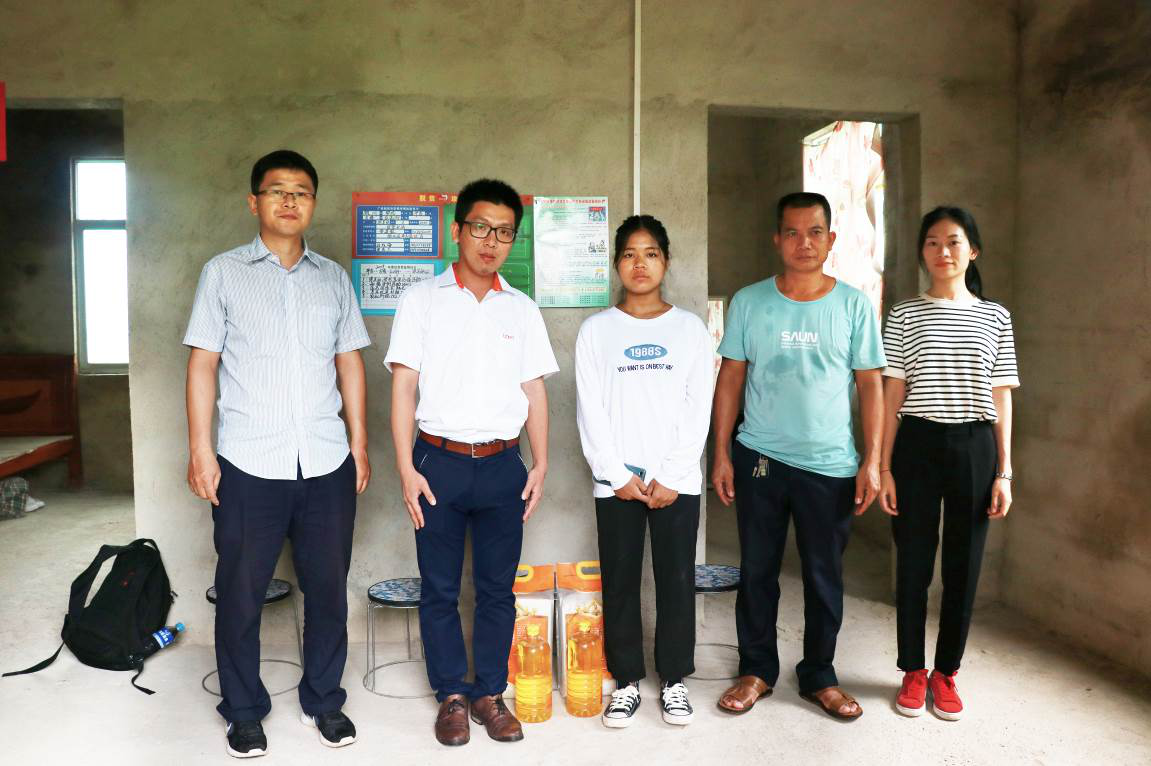 欽州當(dāng)?shù)胤鲐毑块T干部、播恩代表人員與梁美麗同學(xué)(圖左三)合影