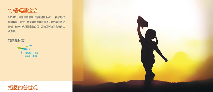 播恩于2008年創(chuàng)建“竹蜻蜓慈善”。持續(xù)進(jìn)行捐助教育、賑災(zāi)、扶貧等慈善公益活動,努力承擔(dān)社會責(zé)任,做一個優(yōu)秀的企業(yè)公民,為播恩樹立了良好的社會形象。