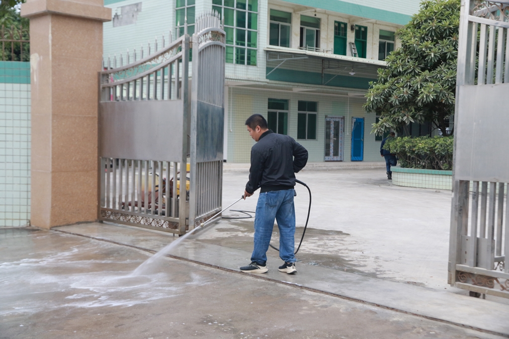 工作人員在門口進(jìn)行消毒
