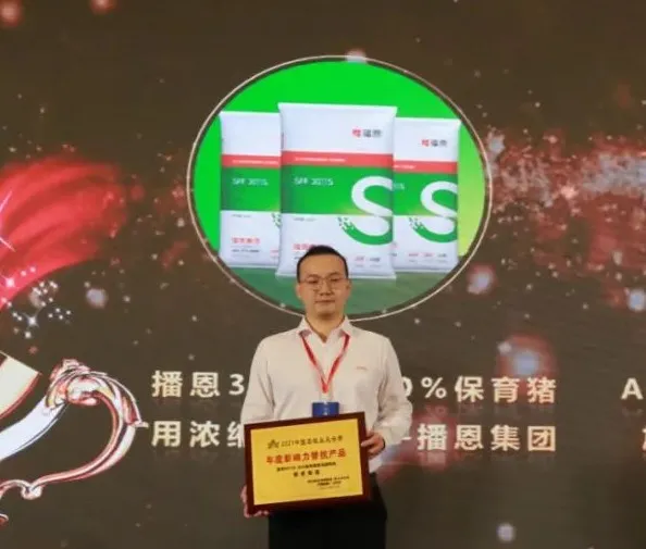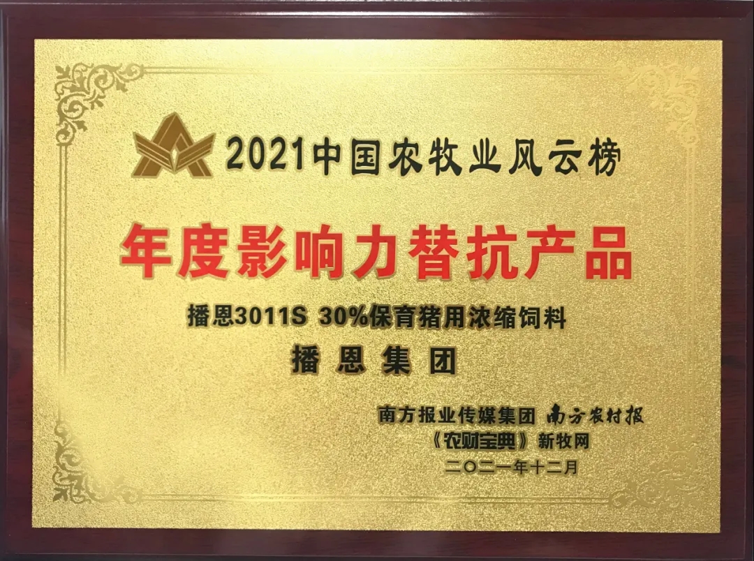 2021年12月11日,第11屆中國(guó)農(nóng)牧業(yè)風(fēng)云會(huì)、農(nóng)財(cái)寶典新牧網(wǎng)年會(huì)暨廣東省現(xiàn)代畜禽產(chǎn)業(yè)園研討會(huì)在廣州閉幕。在2021年中國(guó)農(nóng)牧業(yè)風(fēng)云榜頒獎(jiǎng)會(huì)上,播恩集團(tuán)產(chǎn)品“播恩3011S 30%保育豬用濃縮飼料”榮獲“年度影響力替抗產(chǎn)品”獎(jiǎng)項(xiàng),播恩集團(tuán)技術(shù)服務(wù)副總監(jiān)巴少波上臺(tái)領(lǐng)取獲獎(jiǎng)牌匾。