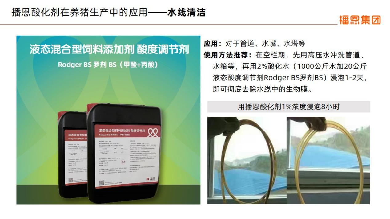 他指出,酸化劑可以降低生豬胃腸道pH值,減少大腸桿菌、沙門氏菌等致病菌的數(shù)量。播恩集團液體酸化劑具有豐富的技術(shù)歷史沿革,特點是高效、安全、穩(wěn)定、促健康等。酸化劑主要運用在豬場消毒、清潔、動物飲水添加等多方面,可有效抑菌、抗病毒,提升豬場生產(chǎn)性能。