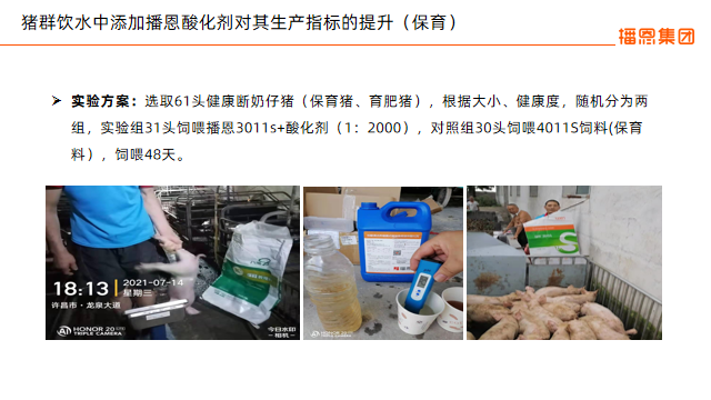 向老師還在現(xiàn)場展示了四組對比實證數(shù)據(jù),從保育豬飲水酸化、懷孕母豬飲水酸化兩個角度印證液體酸化劑的作用。實驗表明,保育豬和懷孕母豬飲水使用播恩雙酸養(yǎng)殖模式酸化劑后,回報率大大提升。