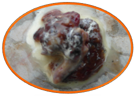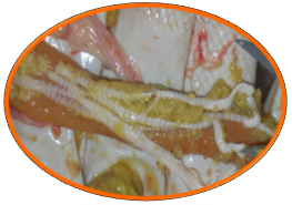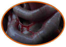 圖3- 糞便上有米粒大小,乳白色的節(jié)片 圖4- 腸粘膜肥厚,可見(jiàn)蟲(chóng)體吸附于小腸粘膜上