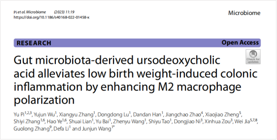 近日,由播恩集團董事長鄒新華和中國農(nóng)業(yè)大學(xué)王軍軍教授聯(lián)合培養(yǎng)的博士后皮宇獲得重大突破,在《微生物組》(Microbiome)雜志發(fā)表題為“腸道微生物代謝產(chǎn)物熊脫氧膽酸通過促進腸道M2型巨噬細(xì)胞極化緩解低出生重仔豬結(jié)腸炎癥”(“Gut microbiota-derived ursodeoxycholic acid alleviates low birth weight-induced colonic inflammation by enhancing M2 macrophage polarization”)的研究論文,揭示了膽汁酸通過調(diào)控腸道巨噬細(xì)胞分型、緩解宮內(nèi)生長受限(IUGR)豬腸道損傷的分子機制。