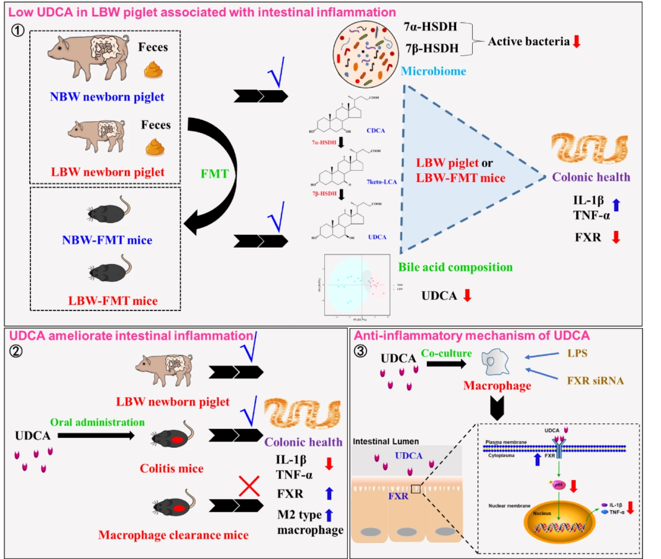 研究結(jié)果顯示,LBW和正常出生體重新生仔豬的糞便微生物組和BAs分布均存在顯著性差異,特別是熊脫氧膽酸(UDCA)在LBW仔豬腸道中顯著降低,并伴隨著與UDCA合成相關(guān)菌群的豐度降低,如7α-羥基類固醇脫氫酶(7α-HSDH)和7β-羥基類固醇脫氫酶(7β-HSDH)(這些微生物能夠?qū)⒛c道中的鵝脫氧膽酸CDCA轉(zhuǎn)化為UDCA)。進一步將LBW新生仔豬的糞菌移植到抗生素清菌后的小鼠體內(nèi),可導(dǎo)致受體鼠腸道炎癥增強、腸道中UDCA含量降低、7α-HSDH和7β-HSDH相關(guān)膽汁酸代謝菌的豐度降低。重要的是,口服UDCA(在LBW仔豬腸道中減少的主要膽汁酸)可通過促進巨噬細(xì)胞向M2型極化從而顯著緩解LBW仔豬、LBW-FMT受體小鼠和結(jié)腸炎造模小鼠的腸道炎癥。在分子機制上,UDCA是通過與BAs受體法尼醇受體(FXR)結(jié)合、抑制巨噬細(xì)胞中NF-κB信號通路的活化,從而減少腸道炎性細(xì)胞因子的產(chǎn)生。