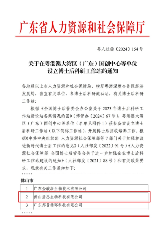 近日,廣東省人力資源和社會(huì)保障局印發(fā)了《關(guān)于在粵港澳大灣區(qū)(廣東)國創(chuàng)中心等單位設(shè)立博士后科研工作站的通知》(粵人社函〔2024〕154號),佛山播恩生物科技有限公司成功獲批設(shè)立國家級博士后科研工作站。這一榮譽(yù)標(biāo)志著佛山播恩在高層次人才培養(yǎng)、科研創(chuàng)新及產(chǎn)學(xué)研合作方面邁出了堅(jiān)實(shí)的一步,為企業(yè)未來發(fā)展注入了強(qiáng)勁動(dòng)力。