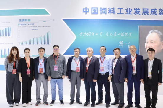 播恩集團(tuán)董事長(zhǎng)鄒新華(左四)于中國(guó)飼料工業(yè)協(xié)會(huì)成立40周年主題展區(qū)現(xiàn)場(chǎng)