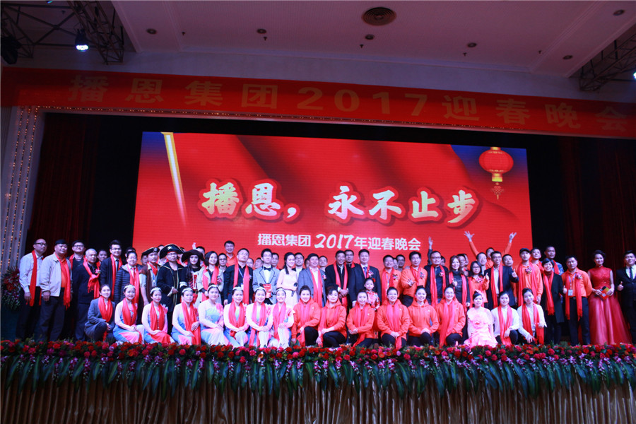 律回春暉漸,萬(wàn)象始更新, 2月5日,播恩集團(tuán)在番禺祈福酒店隆重舉辦了以“播恩,永不止步”為主題的2017年度公司年會(huì)。集團(tuán)總裁鄒新華先生出席晚宴,并發(fā)表新年致辭。本次晚會(huì)共有來(lái)自各大區(qū)/事業(yè)部、工廠生產(chǎn)和管理代表,以及總部職能部門近300名員工一起共度新春。同時(shí),集團(tuán)還特邀了華南農(nóng)業(yè)大學(xué)傅偉龍教授、鄧銜柏教授等專業(yè)人士和同行業(yè)合作伙伴共享狂歡。